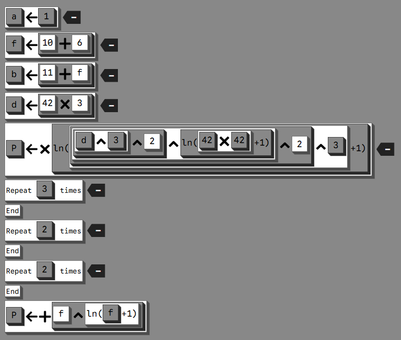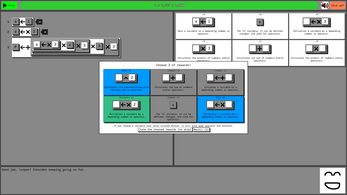 Extremely good game, love it! Only suggestions would be to start with 90% zoom (so that the operator panel has three columns), and some kind of auto-sort for operators/variables. Other than that everything is perfect!