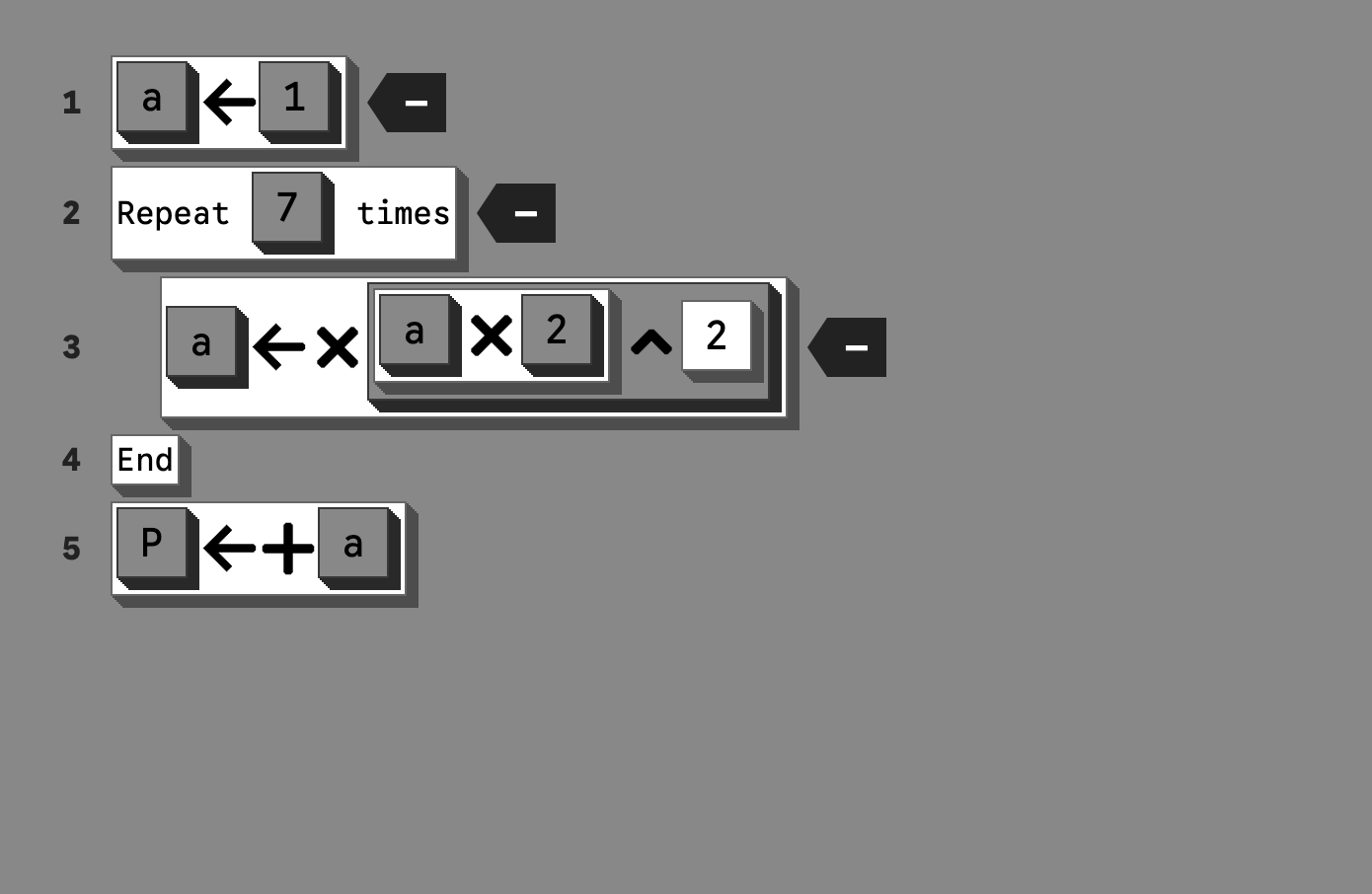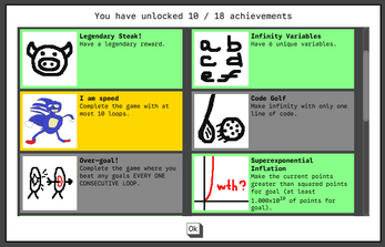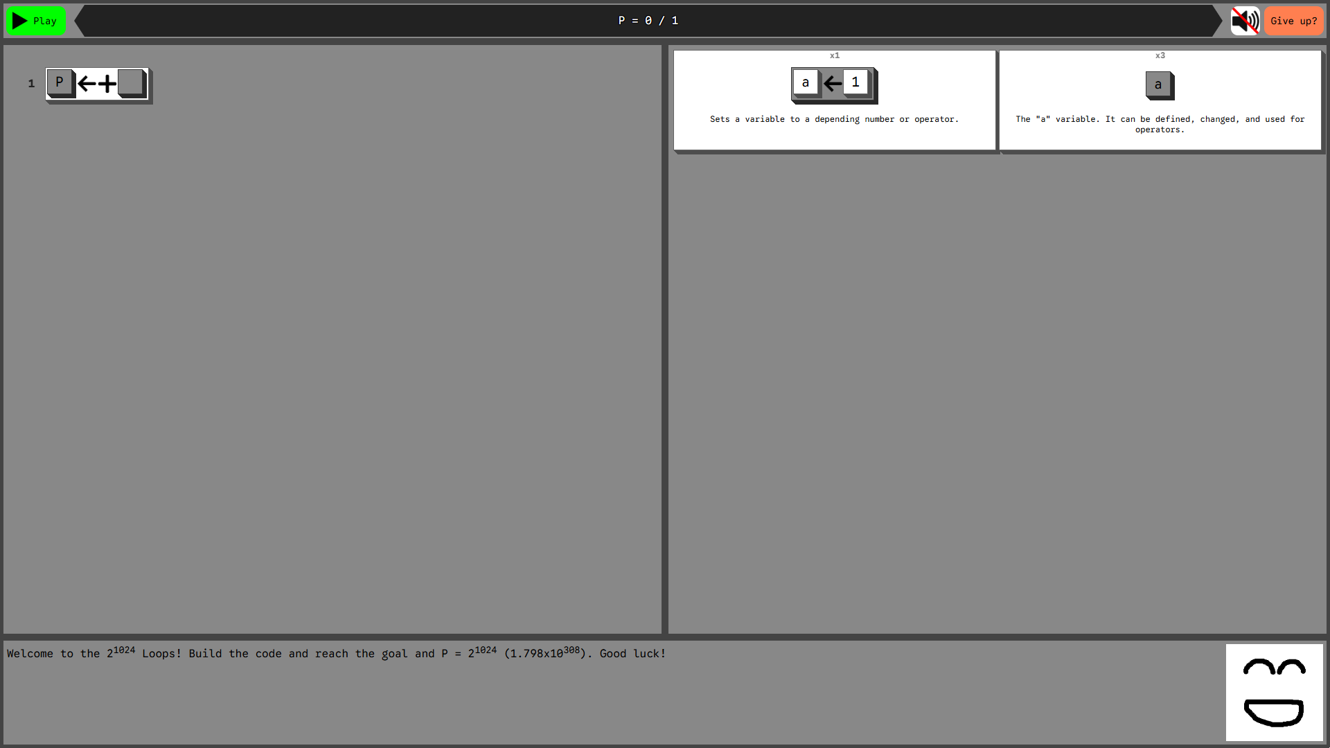 The scratch-like and rogue-like game! Our mission is to reach P = 2^1024 (1.798x10^308), but it is enough to calculate loops? No worries, there are operators, variables, and constants! Achieve goals from rewards, challenge achievements, and find secrets...